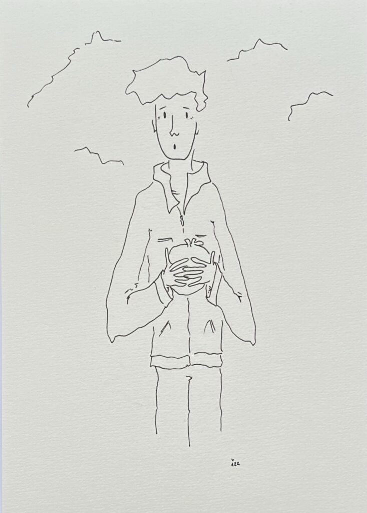 Han cyklede forbi sin hverdag med pizzaria, skrigende børn på fortovet, en hund foran Netto og bageren på hjørnet. Først cyklede han forbi, men så hoppede han af cyklen og trak den hen til bagerens vindue med kager og cafégæster. Inde i butikken bad han om en bolle med smør og en kaffe med mælk, og han lavede en joke om varm kaffe og kolde dage med manden bag disken, og han satte sig op til vinduet og så på sin cykel, imens han spiste. Smørret på bollen var koldt og fedtet mod hans tunge. Kaffen var bitter, men varmede et lille område bag hans egne ribben.